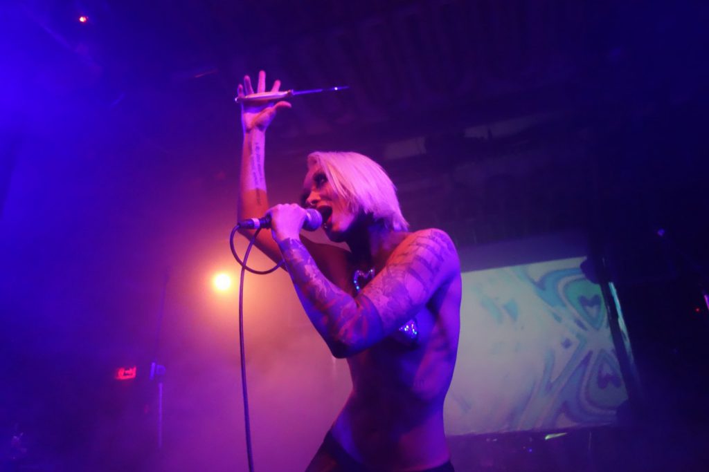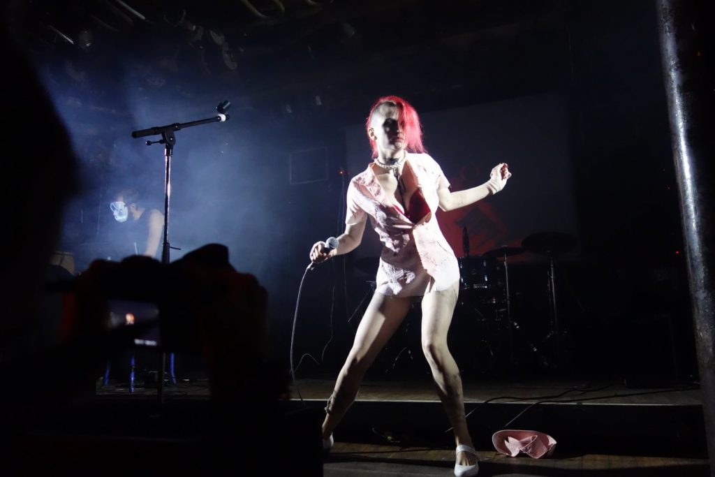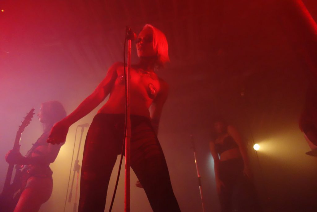 Integraler Bestandteil der Show sind die Kostüme in Dark Wave Ästhetik, mit viel Freude am Exhibitionismus. Frontfrau Areana Peel – mit schweren Stiefeln, zerrissenen Strümpfen, nacktem und bemalten Oberkörper, in Make-up und Frisur an eine weibliche Version des Jokers aus den Batman-Comics erinnernd – und zwei Sängerinnen/Tänzerinnen, hier Kiara Kazumi und Thenia AF, bilden einen Chor, der die durchweg provokanten Texte vorträgt – eine Art Kampftruppe mit homosexuellen Botschaften jenseits der eigenen Schmerzgrenze.
