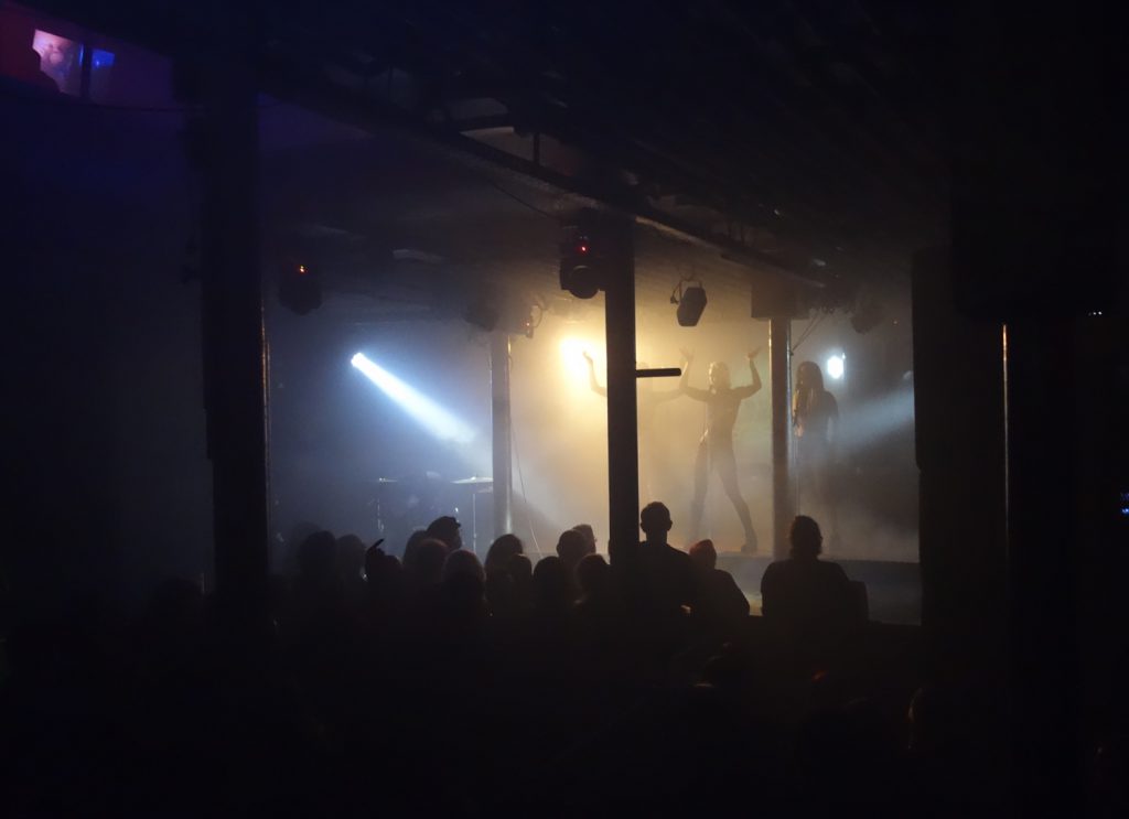 Die Musik ist ein treibender Elektrobeat. Einen Gesang im eigentlichen Sinne gibt es nicht, es sind mehr Parolen, mehr geschrien als gesungen. Die Stücke werden szenisch untermalt, bisweilen unterstützt von zusätzlichen Performerinnen. Bisweilen sind die Botschaften mehr als deutlich. Da wird zum Beispiel ein Kürbis mit aufgemaltem Gesicht zum Männerkopf erklärt. Areana Peel zeigt auf die Männer im Publikum, die allesamt gemeint sein könnten und dann wird der symbolische Schädel mit einem Elekromixer lustvoll ausgehöhlt. Im weiteren Verlauf des Konzerts hat der Männerschädel einen zweiten Auftritt und seine Behandlung wird nicht besser.